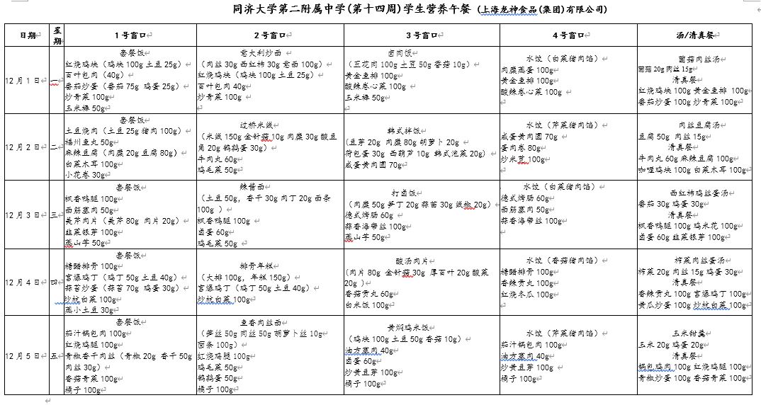 2025学年第一学期第十四周学生营养午餐菜单