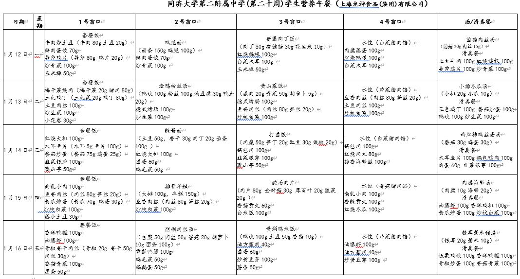 2025学年第一学期第二十周学生营养午餐菜单